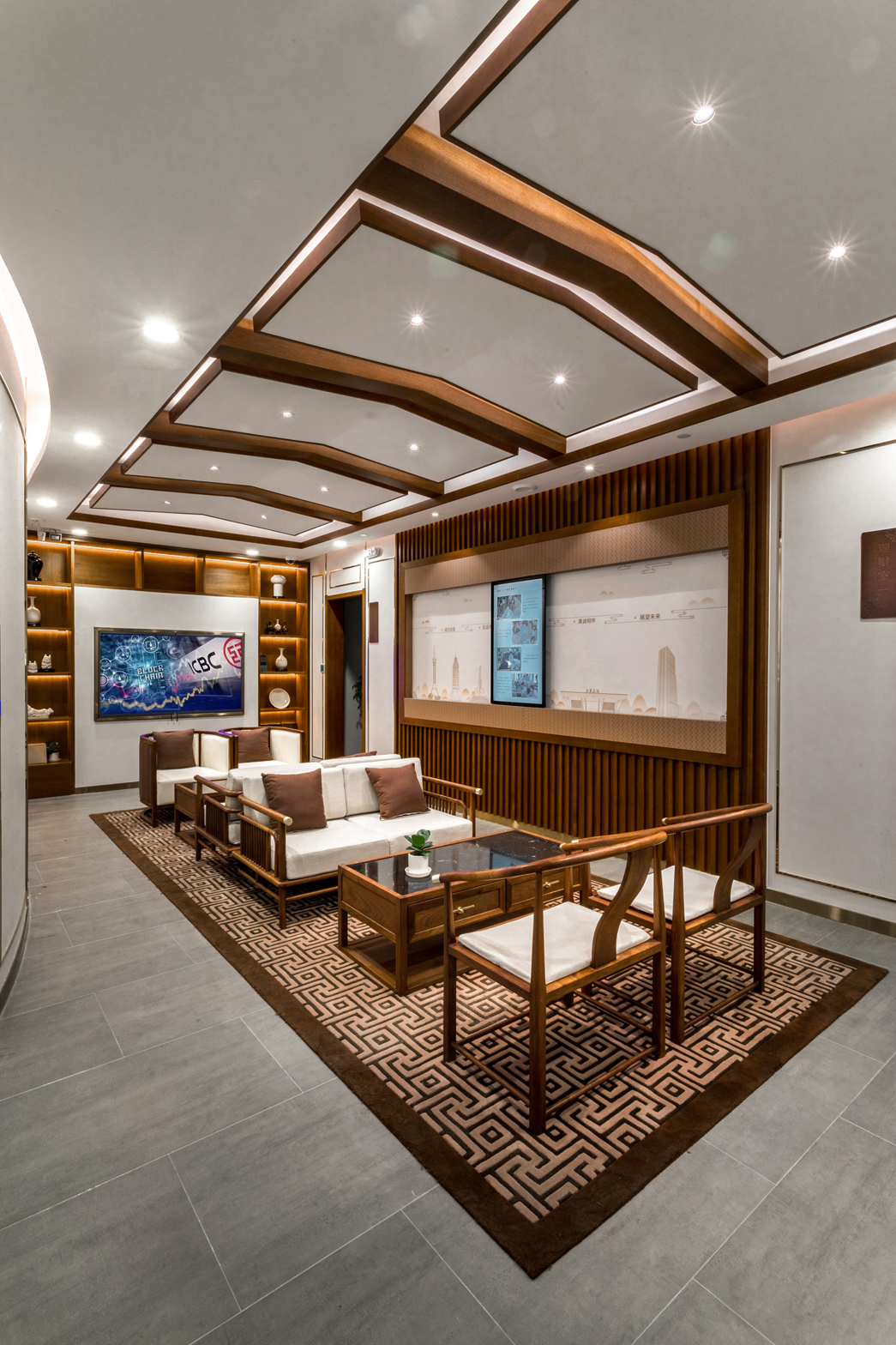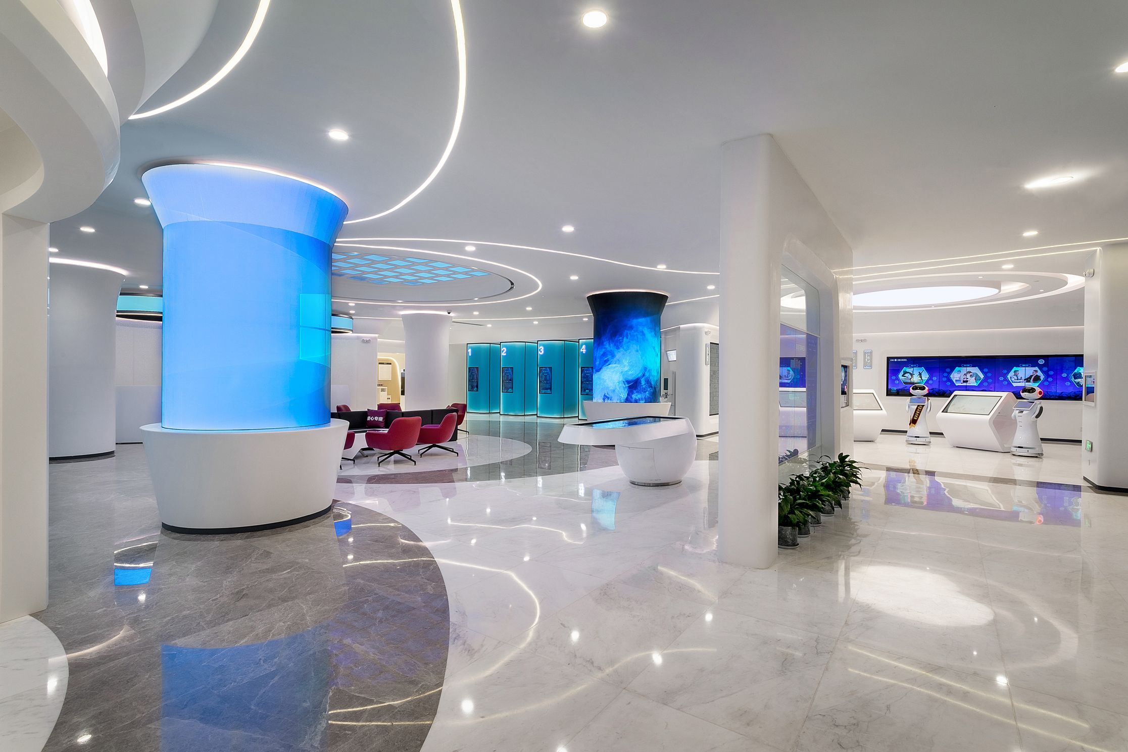 廳堂內(nèi)明亮的光線,流動的波紋和多變的色彩,傳遞著穿越時空的設(shè)計語言,寓意時光的流逝、演變和發(fā)展;燈光和光帶如陽光一般從建筑的外立面延伸到室內(nèi)空間,與設(shè)計主題相呼應(yīng);智能區(qū)屏幕上疾馳而過的復(fù)興號,講述著石家莊——火車?yán)瓉淼某鞘械陌l(fā)展故事。冀州古鼎、定州瓷器、蔚縣剪紙等擺件及飾品,描述著“京畿福地,大美燕趙”的宏偉畫卷。